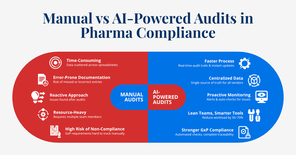 Traditional manual audits are no longer sufficient to keep up with modern GxP requirements. These legacy processes are often characterized by scattered data, reactive troubleshooting, and a high risk of human error. By integrating AI, firms are not just streamlining their workflows; they are fundamentally changing how they manage risk across their entire vendor ecosystem.