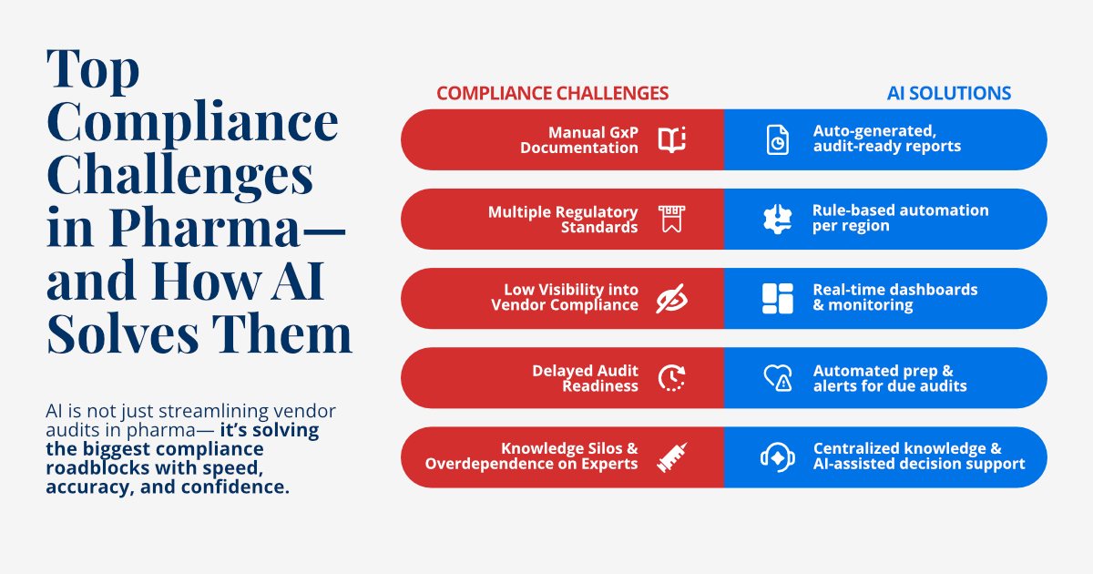Discover how AI is revolutionizing pharmaceutical compliance by solving GxP roadblocks and streamlining vendor audits.